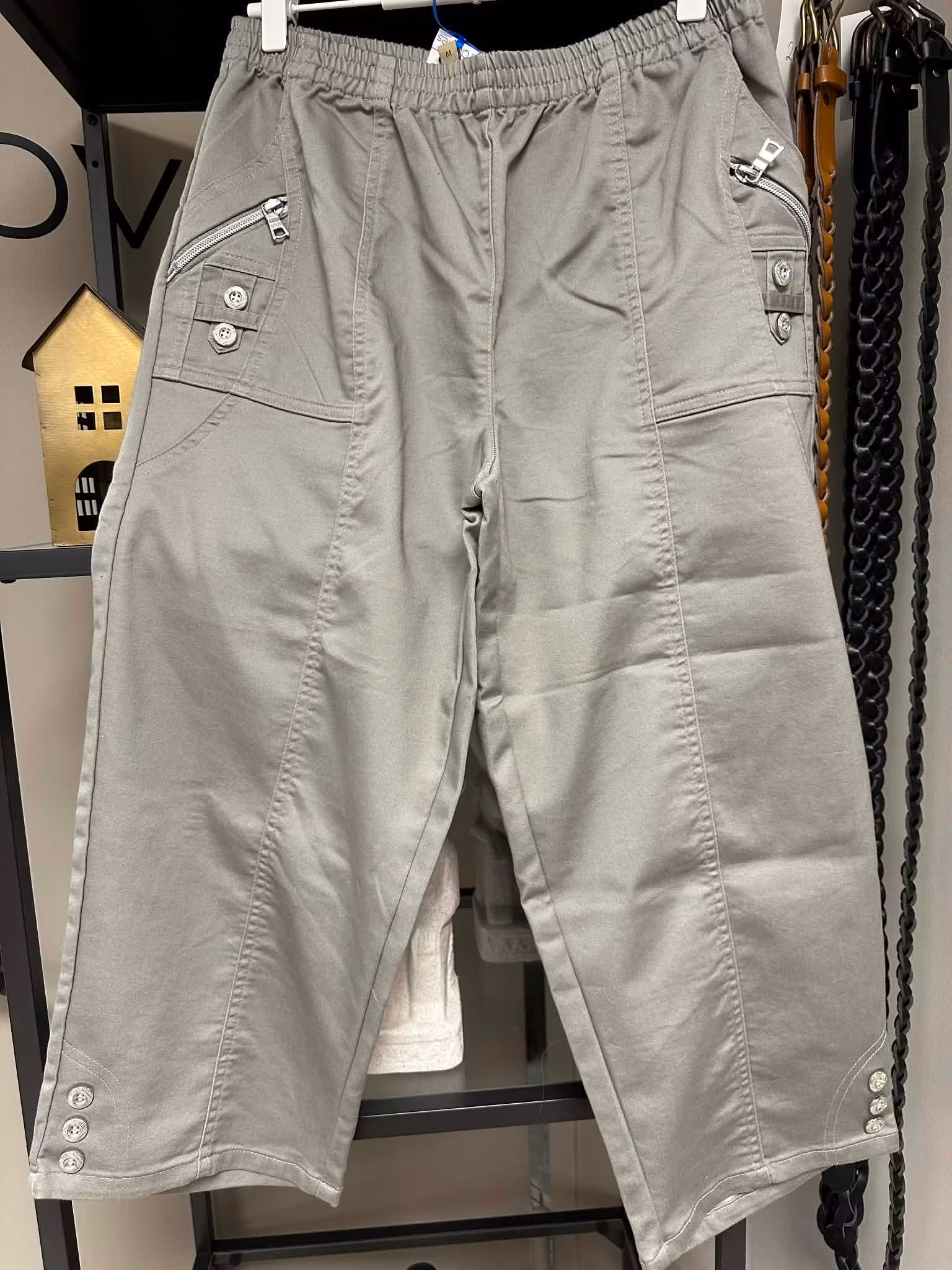 Sköna och stilrena capribyxor i en mjuk beige ton. Elastisk midja för perfekt passform och snygga zip- och knappdetaljer som ger det lilla extra.