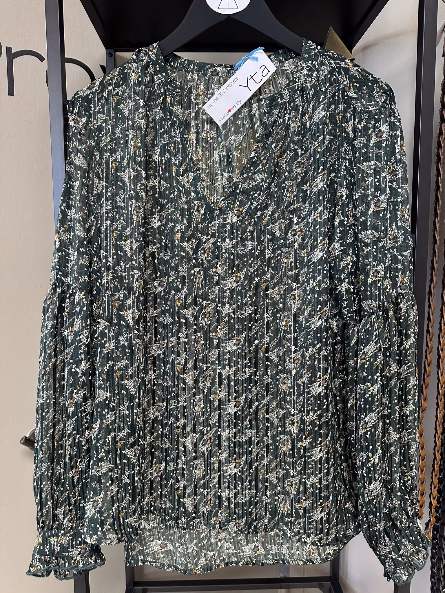Tunn, skir blus i vacker buteljgrön med småmönster och guldtrådar. Dekorativ och användbar!