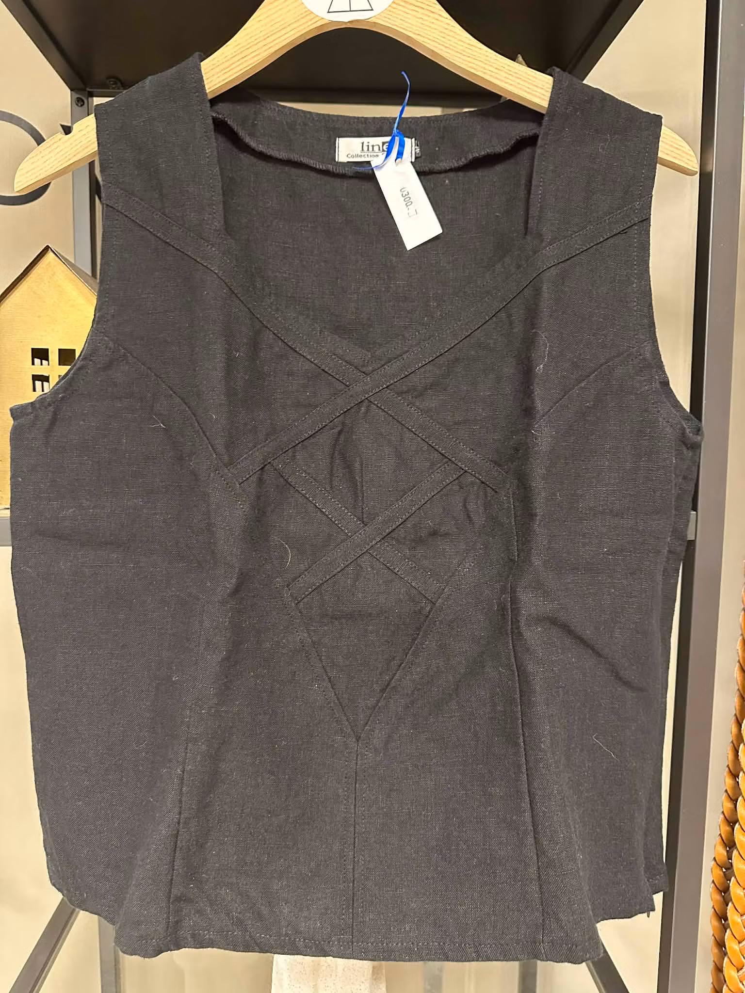 En stilren topp i svart linnestruktur med en unik korsad sömdetalj framtill som ger ett modernt och arbetat uttryck. Den raka modellen gör den enkel att bära både till vardag och lite mer uppklätt.