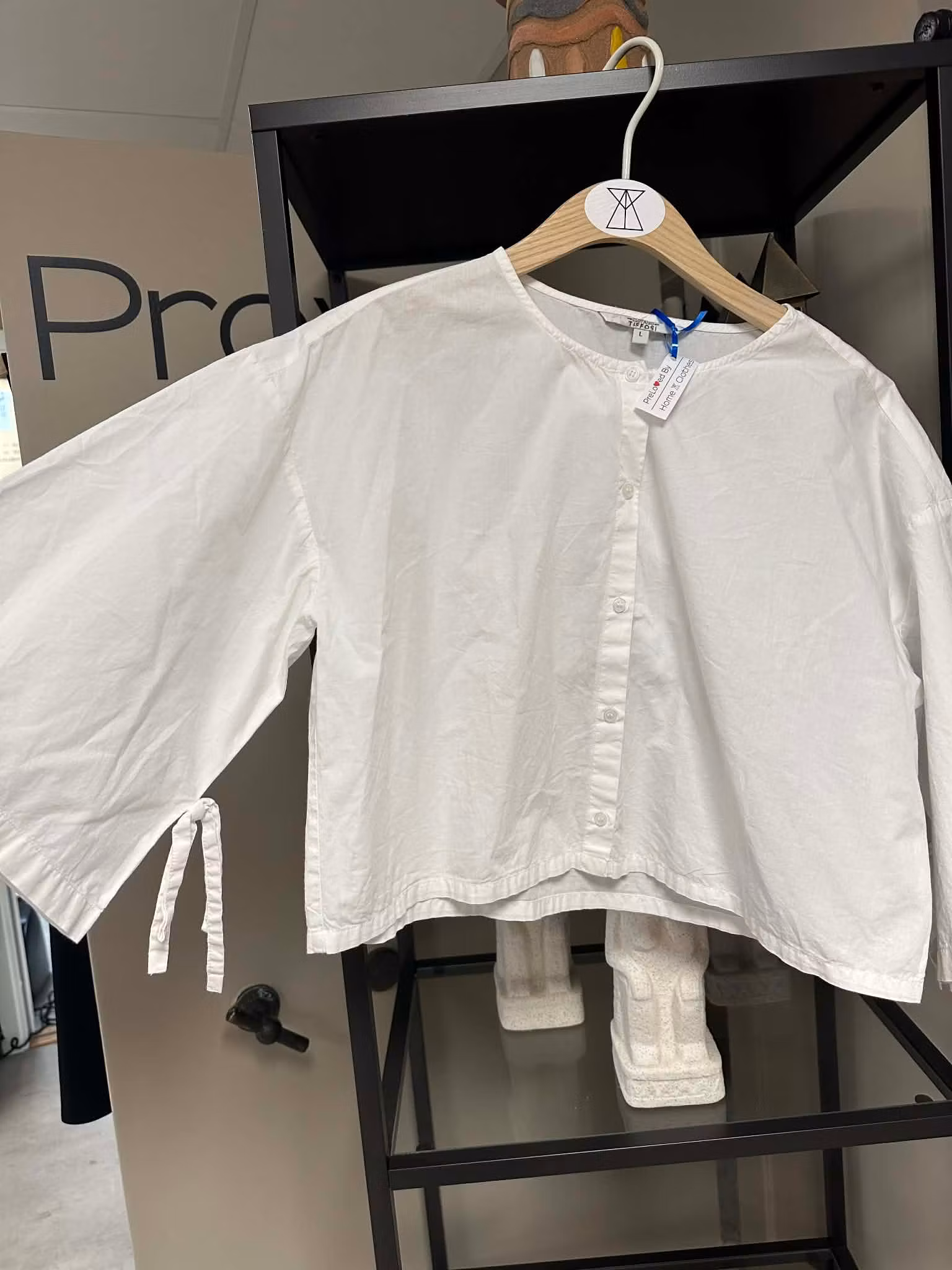 En stilren och luftig vit blus med kortare längd och vida ärmar. De knytbara detaljerna i ärmsluten ger en mjuk och feminin touch, medan den rena designen gör den enkel att matcha.