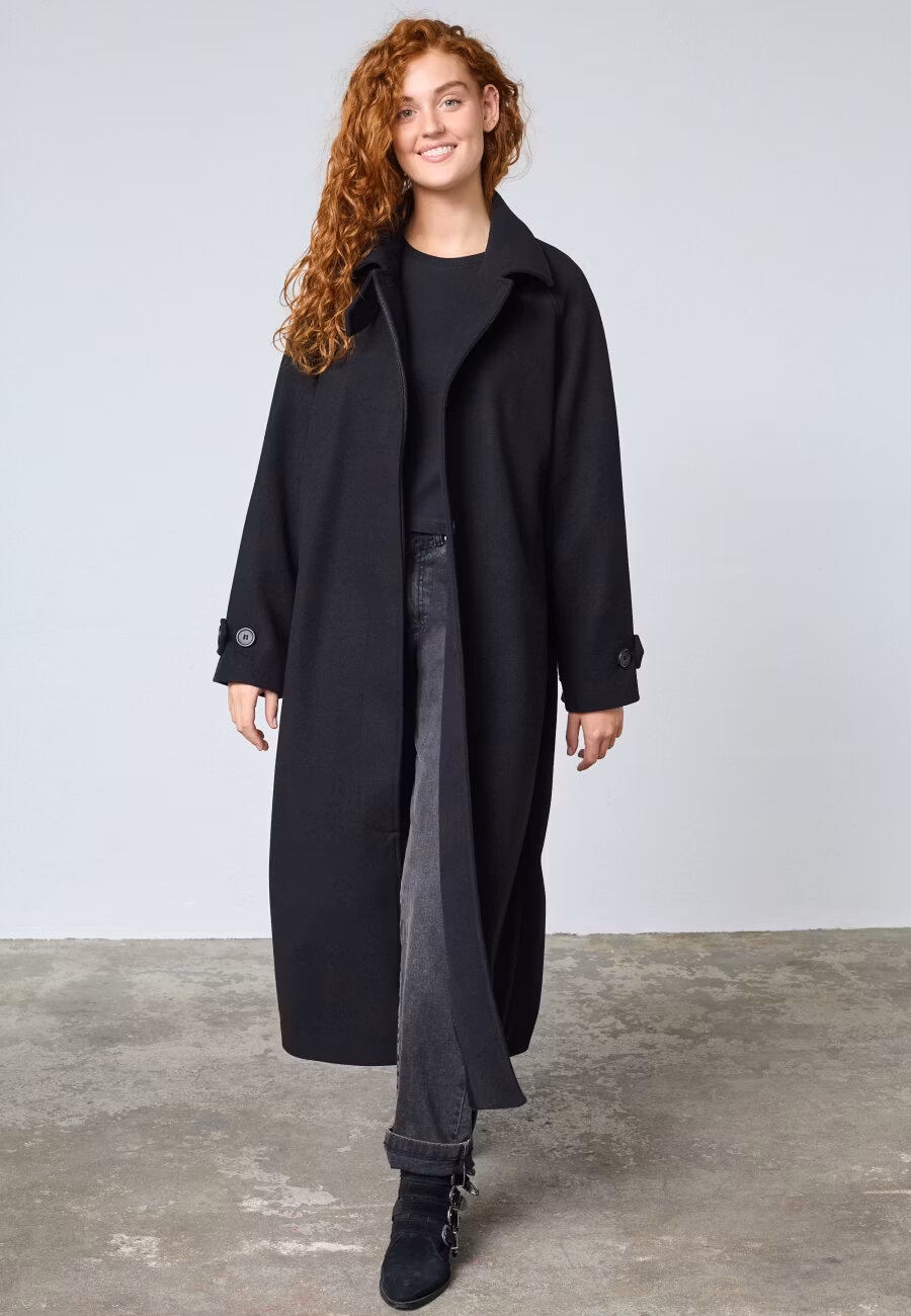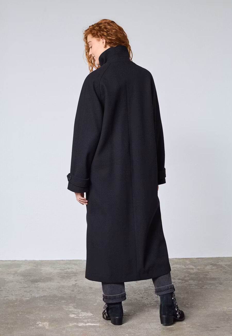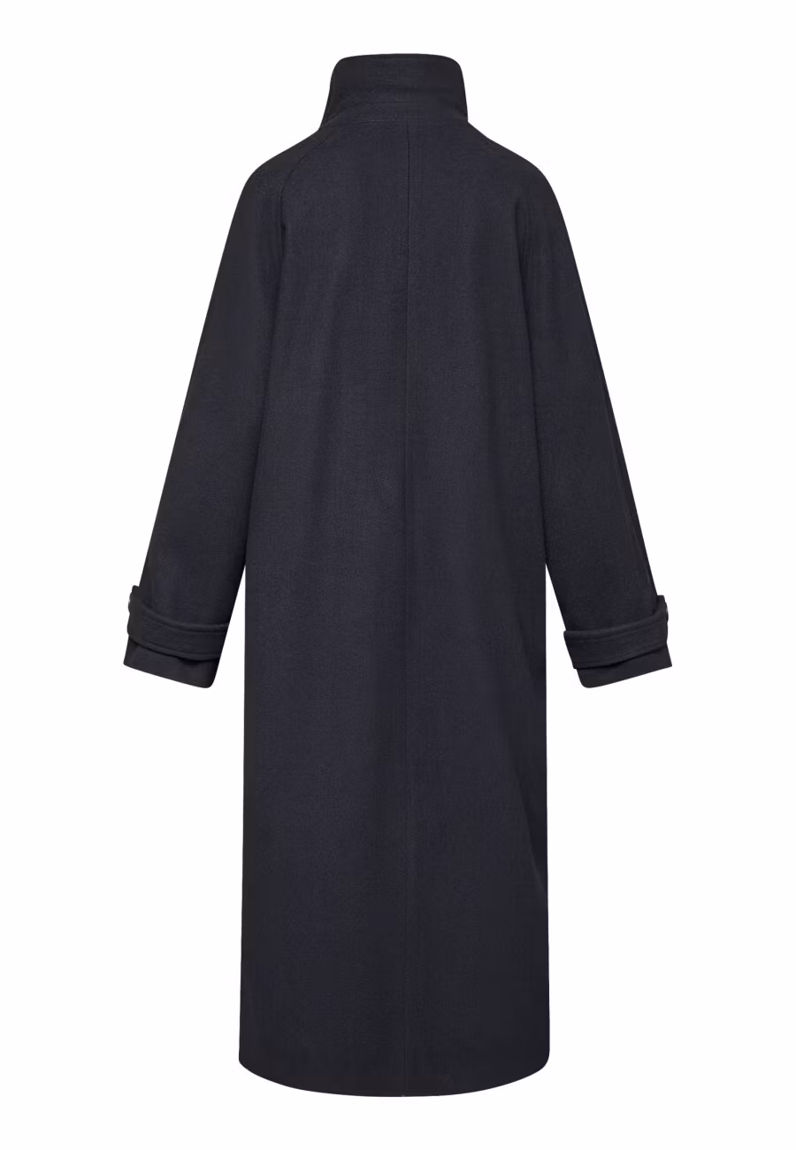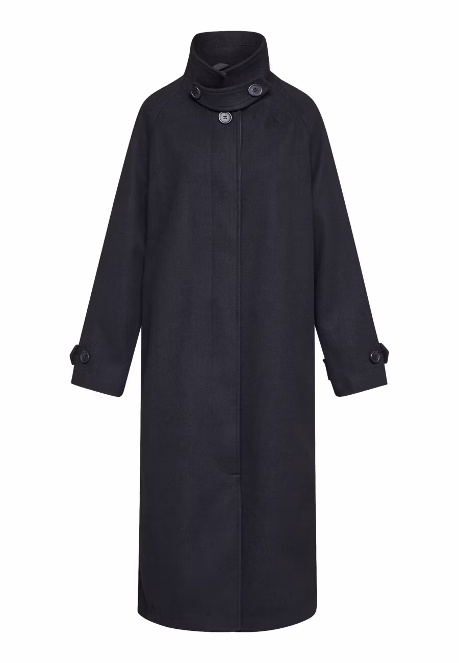 Caleb Long från Sisters Point är en stilren lång jacka som kombinerar minimalistisk design med ett modernt uttryck. Den höga halsen och de stora knapparna ger e