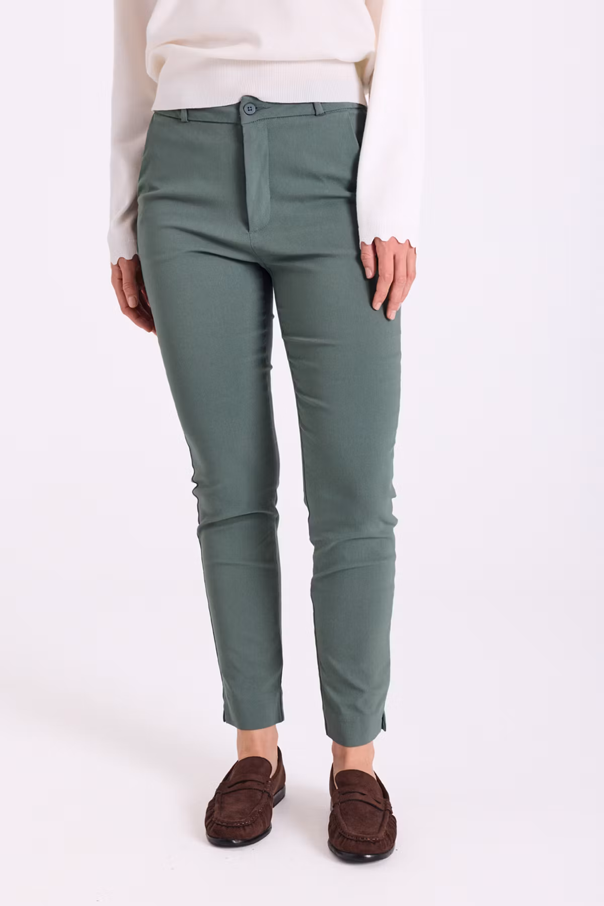 Dessa ankellånga byxor har en följsam passform som smickrar din figur och ger en sofistikerad silhuett. Den högkvalitativa tyget ser till att du känner dig bekväm samtidigt som du ser stilsäker ut, oavsett om det är på kontoret eller vid en middagsbjudning. Matcha dem med en snygg blus eller en avslappnad t-shirt för en mångsidig look som tar dig från dag till kväll med lätthet.