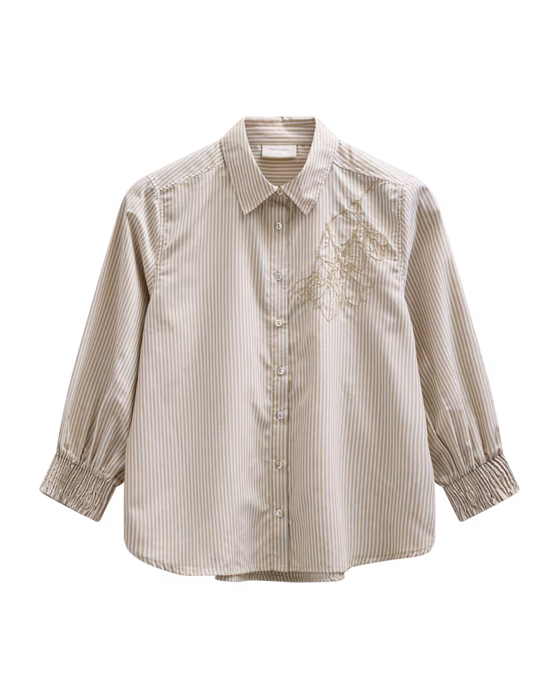De trekvartsärmarna med smockdetalj vid ärmsluten ger ett feminint och modernt uttryck, medan den diskreta broderade detaljen på bröstet adderar en elegant touch.