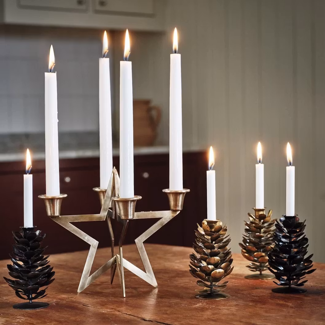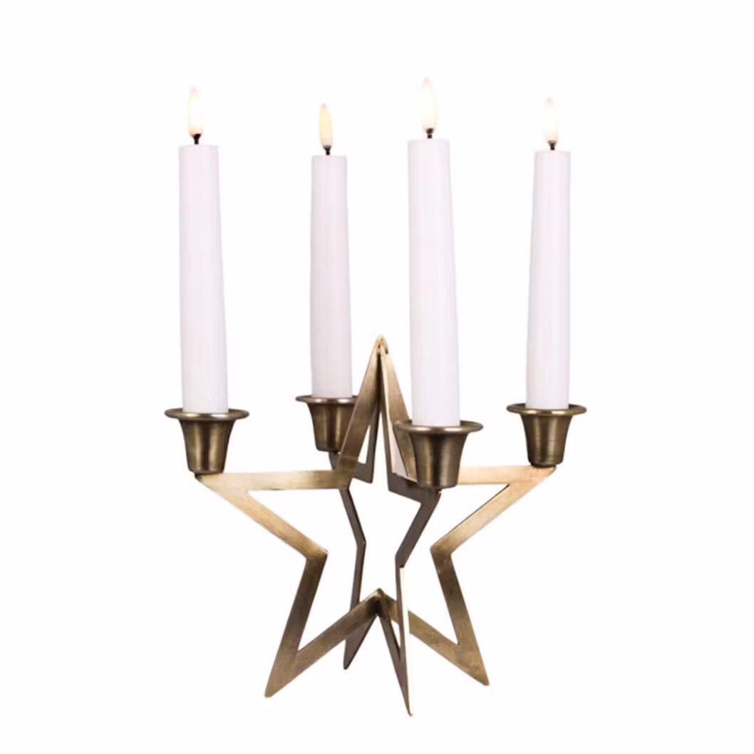 Ljusstake Stjärna Antik Mässing är en vacker ljusstake i antik mässing med en stjärnaformad design som håller fyra kronljus. Den ger ett stämningsfullt intryck